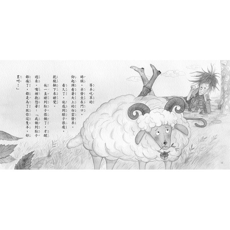 他一直睡到肚子很餓了,才醒過來。嘴裡抱怨著:「我餓到肚子都痛了,都是為了放你這隻羊,好累呵!」