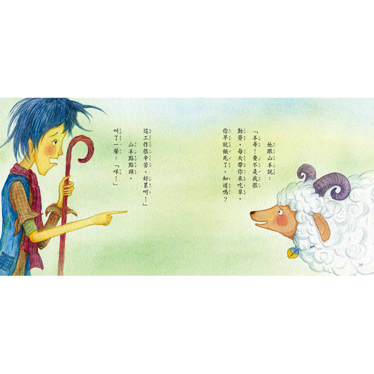 他跟山羊說:「羊哥!要不是我很勤勞,每天帶你來吃草,你早就餓死了。知道嗎?這工作很辛苦。好累呵!」