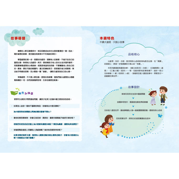 不僅以感恩、知足、自信、堅持等核心品格教育為理念出發,在「閱讀」的基礎上,更進一步強調「悅讀」。嚴選經典童話故事,在維持原有故事架構下,設計一對小兄妹樂樂和貝貝,穿越時空進入故事,和故事裡的人物一起探險,並將領悟到的道理實踐在現實生活中。現在就讓可愛又活潑的兄妹倆,帶領聆聽的孩子一起馳騁於繽紛的異世界吧!