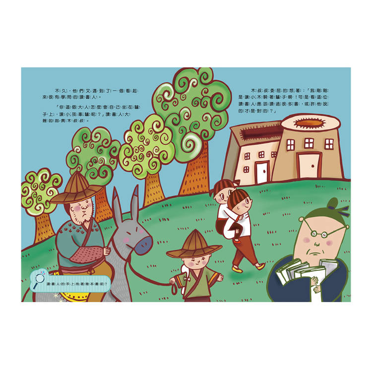 木叔叔和小木父子牽著驢子到城裡,一路上遇到了好多好多人,有人說有驢子不騎是傻瓜,也有人說爸爸該騎驢子,又有人說爸爸不該騎驢子,還有人說他們虐待動物……到底誰該騎驢子呢?