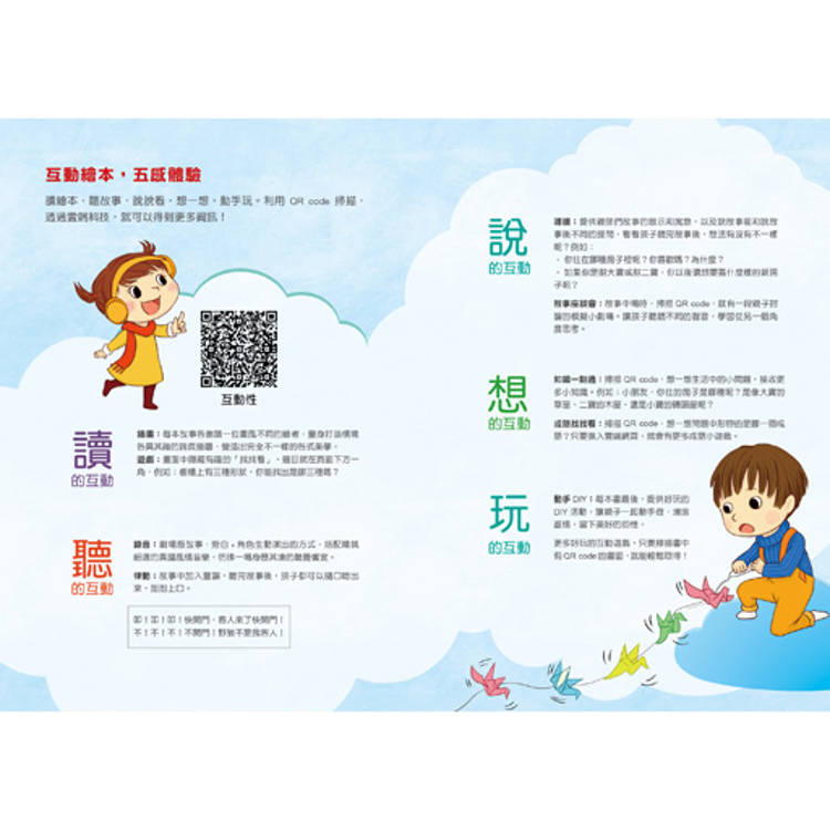 讀繪本,聽故事,說說看,想一想,動手玩。利用 QR code 掃描,透過雲端科技,就可以得到更多資訊!
