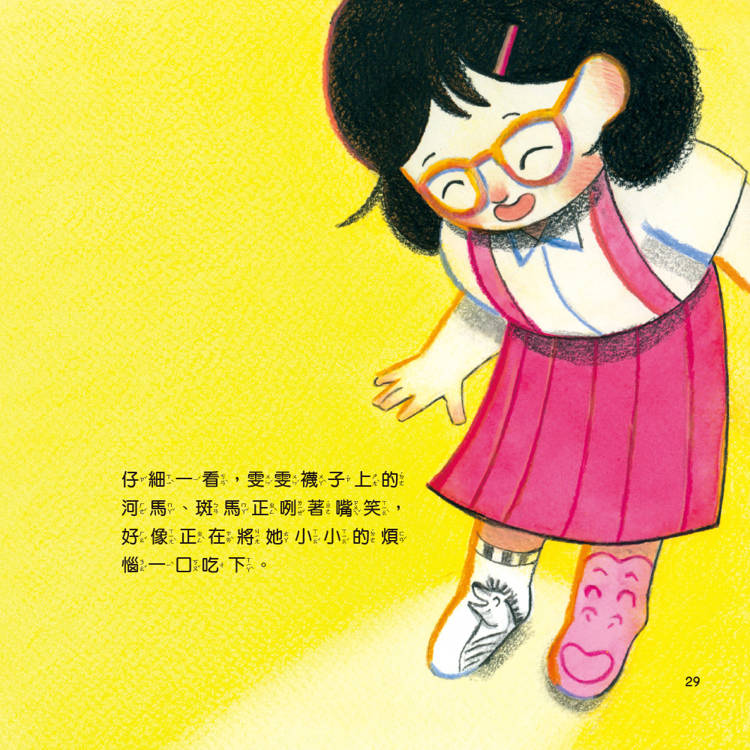 「上學沿途的風景和平常一樣,但雯雯腳上的兩隻襪子,卻興高采烈的睜大著眼睛,因為他們從來沒有一起出來呢!」