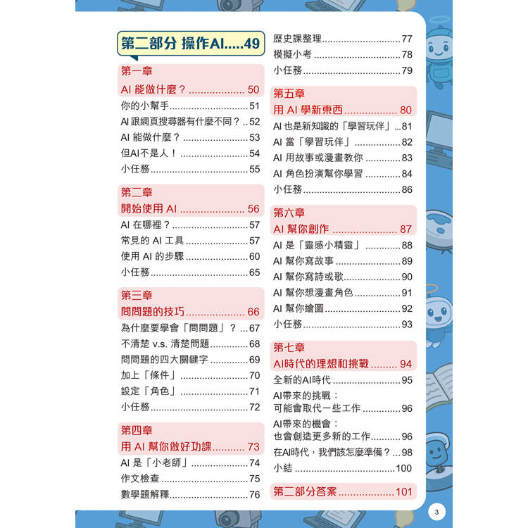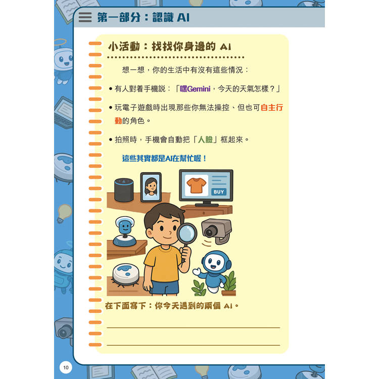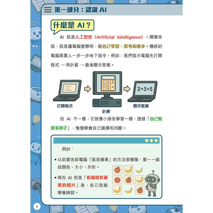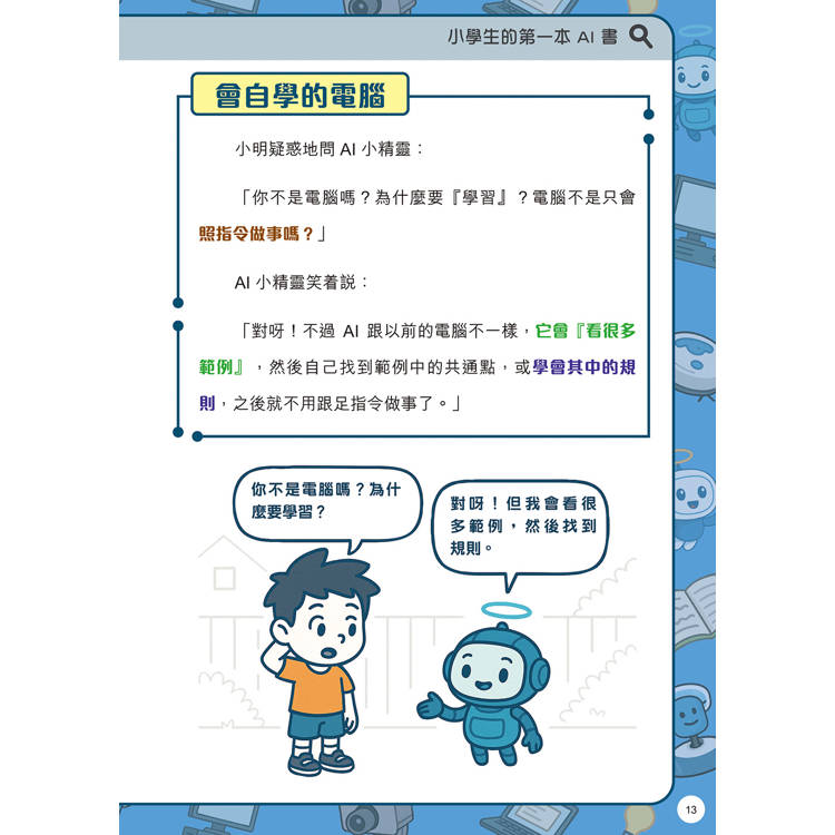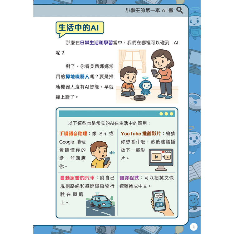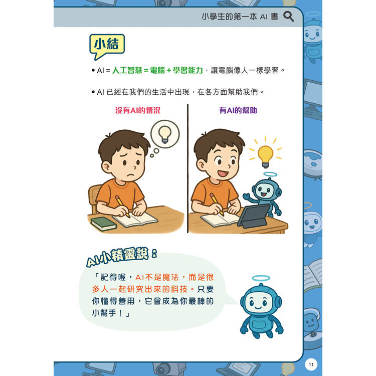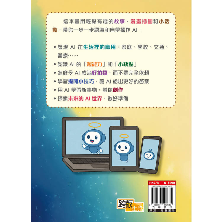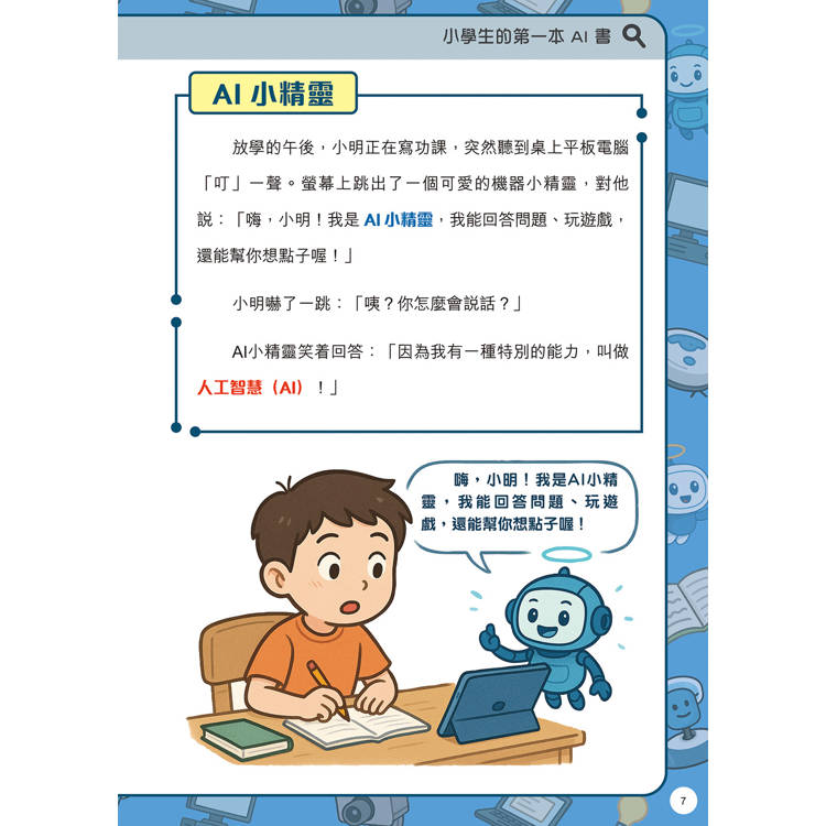 這本書用輕鬆有趣的故事、漫畫插圖和小活動,帶小朋友一步一步認識和自學操作 AI: