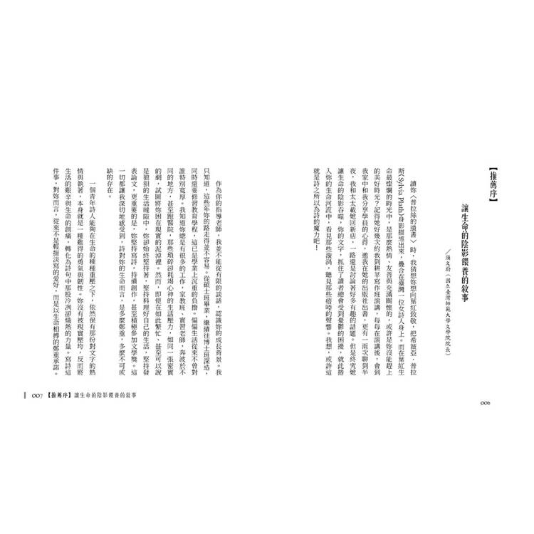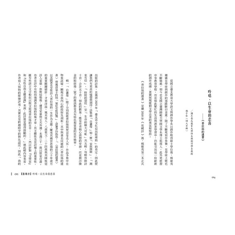《普拉絲的遺書》是妳這段生命歷程的結晶,感謝妳沒有因為生活的重壓而放棄,沒有因為內心的創傷而沉默。請繼續寫下去,繼續用妳獨特的眼睛觀察世界,用妳真摯的心靈感受生命,相信在漫漫詩路上,妳讓生命的陰影餵養的敘事,會描繪出其他詩人沒見過的風景。