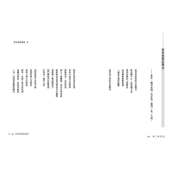 詩末以「大唐盛世已結束/遺下,白樂天的一首/長恨歌,詩不解恨/只記錄盛世掉落的過程/總計八百四十個字的/極樂燦爛」。此外,系列批判詩作也接續不斷,〈情關〉以金庸武俠小說為本,〈孤城閉〉寫小說改編戲劇,〈雛菊〉和〈素媛〉則是韓國電影承繼,至於〈蜜蜂〉及〈不要問我與活著有關的問題〉同為組詩設計,後者更可以看出致敬楊牧〈有人問我公理與正義的問題〉的痕跡: