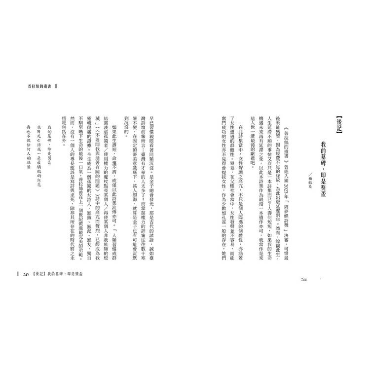 《普拉絲的遺書》是詩人楊敏夷歷時多年沉潛所誕生的第二本詩集,本書曾入圍第三屆周夢蝶詩獎決審,她以女性主體書寫面對命運、父權與時代,獨特的情感力道與極富張力的語言,是其創作生命中一次重要的自我推進。