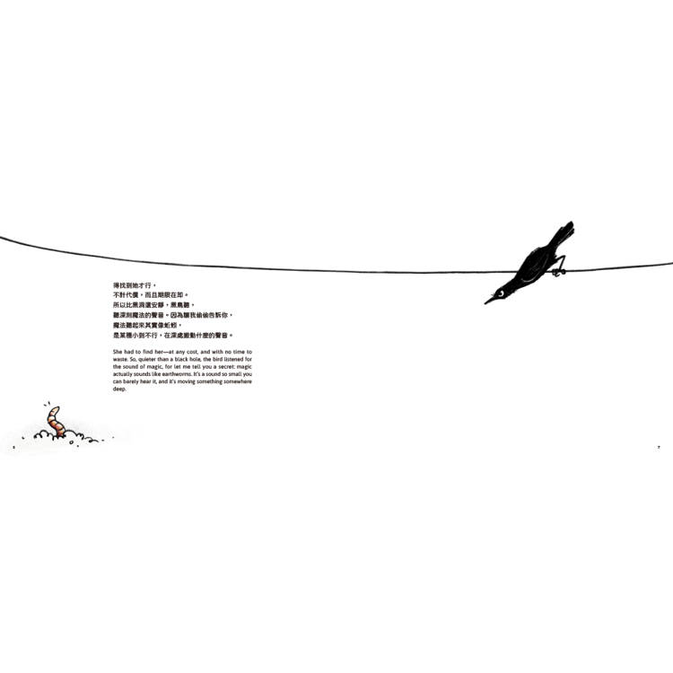She had to find her—at any cost, and with no time to waste. So, quieter than a black hole, the bird listened for the sound of magic, for let me tell you a secret: magic actually sounds like earthworms. It's a sound so small you can barely hear it, and it's moving something somewhere deep.