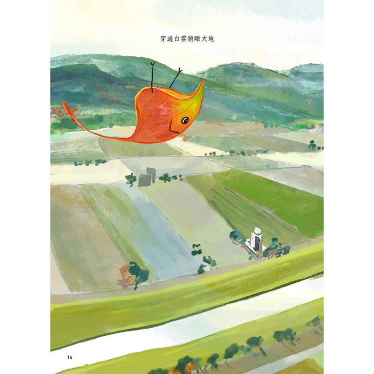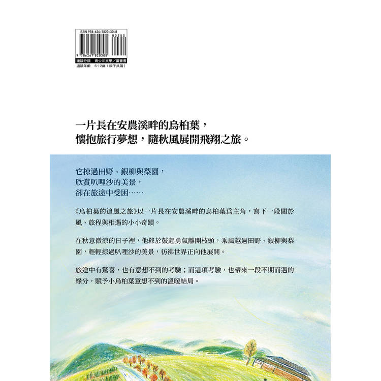 在追風之旅中,小烏桕葉從高處俯瞰時,覺得小溪變細長、田地變迷你、房屋像火柴盒。然而,當他降落在安農溪清涼的水波上,滑翔過兩岸紅著臉的落羽松祕境時,他的旅程卻遭遇了困境,更幸運得到解救。一個冒險的故事,無非想傳達旅行與生態保育有時和諧,有時衝突。要如何以更高的智慧面對?小烏桕葉經歷的故事,絕對有啟發的意義。