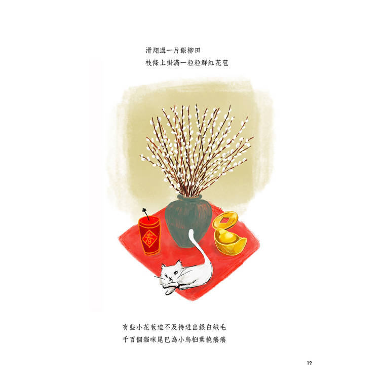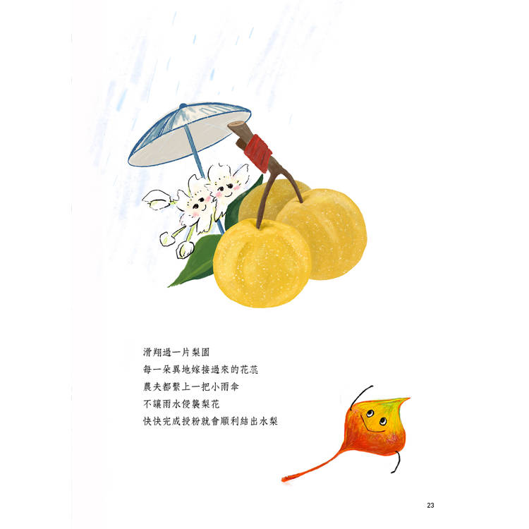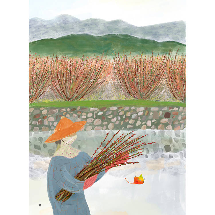 三星的農業景觀隨著季節的腳步呈現出豐富的層次。當小烏桕葉告別夏日的蟬鳴,追逐著強勁的東北季風時,牠俯瞰大地,看到了秋收後的田地變成了精緻又美麗的拼圖。在農田之上,牠滑翔而過銀柳田、蔥田與梨園,書中以充滿詩意的譬喻,希望讓讀者也來到三星,探訪貓咪尾巴般可愛的銀柳、翠綠寶劍般的三星蔥還有甜美的水梨。