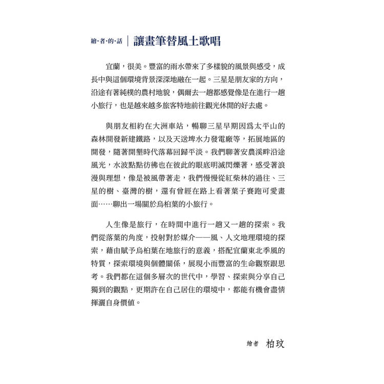 最後,謹向所有參與本書製作與推動的人員致上最誠摯的謝意。感謝本書繪者游柏玟女士,以細膩筆觸描繪安農溪畔的四季風光與烏桕葉的生命姿態,為讀者帶來一段充滿故事的視覺旅程。同時,特別感謝三星數位機會中心的朱哲宏先生,以及慷慨支持本書的三星圖書館林孟君館長,正是有了在地夥伴的熱心協助,才讓這段追風之旅得以完整地展開。衷心感謝我的辦公室同仁吳詩葶小姐,在出版過程中細心處理各項行政作業,讓本書得以順利完成。
