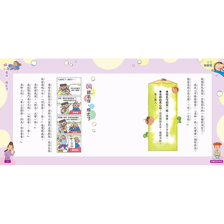 不過別這麼嚴肅,這本書的主旨並不是在探討「班長的權利與義務」,當然也不是「班長祕笈一百條」,而是用很輕鬆的筆調,記錄一位小學班長有趣的校園生活故事。