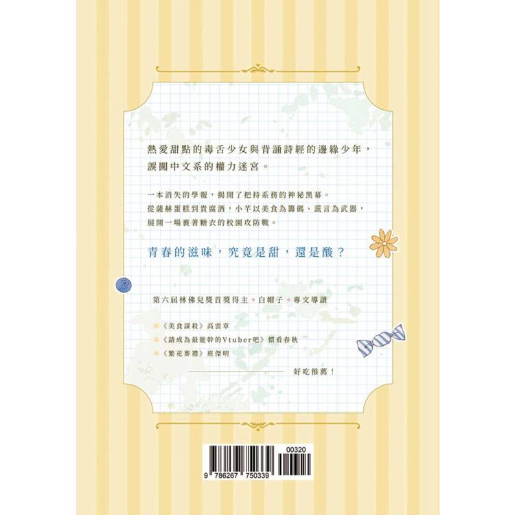 跟其他校園推理比起來,《甜與酸的況味》獨特的況味在哪裡呢?答案是它「表裡不一」,乍看之下是香甜可口的蛋糕,覆以青春推理故事的糖霜,一刀切開,卻是立意深刻、風味濃厚的政治寓言,坊間幾無競品。
