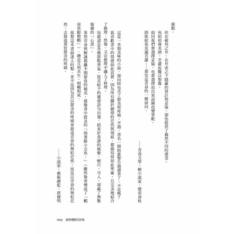 我想這本書最迷人的點,並不是因為其以甜美的疼痛來敘述青春的無垢茫然;而是以青春的無垢茫然,去敘述那份甜美的疼痛。——小說家、藝術總監.班傑明