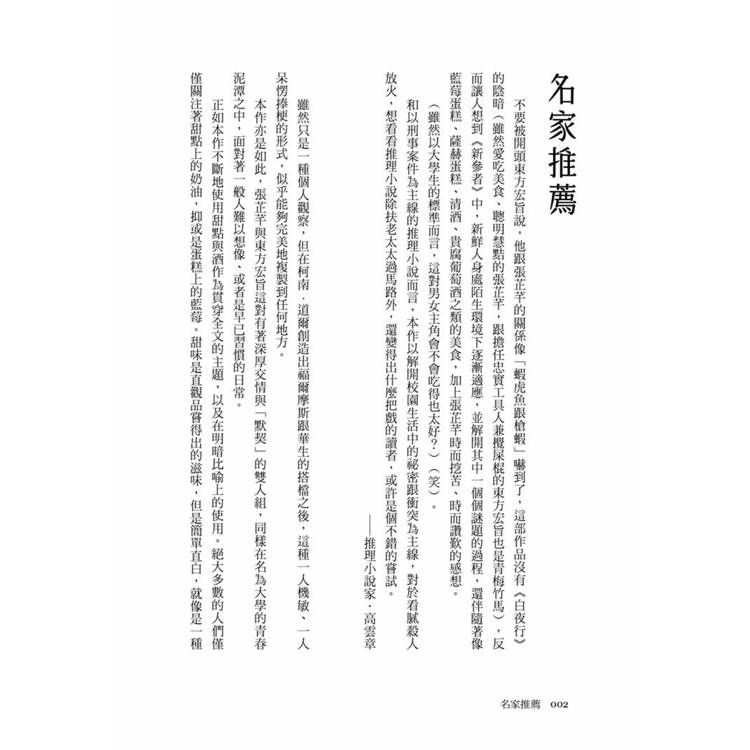 不要被開頭東方宏旨說,他跟張芷芊的關係像「蝦虎魚跟槍蝦」嚇到了,這部作品沒有《白夜行》的陰暗(雖然愛吃美食、聰明慧黠的張芷芊,跟擔任忠實工具人兼攪屎棍的東方宏旨也是青梅竹馬),反而讓人想到《新參者》中,新鮮人身處陌生環境下逐漸適應,並解開其中一個個謎題的過程,還伴隨著像藍莓蛋糕、薩赫蛋糕、清酒、貴腐葡萄酒之類的美食,加上張芷芊時而挖苦、時而讚歎的感想。