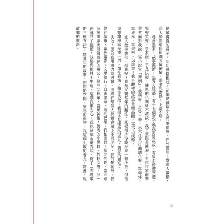 原鄉在每個人身體會留下不同印記,我的是勒痕。我嚮往城市,歐洲電影,文學旅行,自由恣意,紐約巴黎。……身體有勒痕,為了鬆綁,為了自由,為了再度叛逃,故鄉在後追趕,我必須繼續書寫。