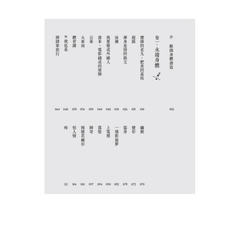走過暗夜,他勇敢揭露生命之痛,哀感頑豔。移開視線,凝視他人身體,肥肚有故事,皺紋藏記憶,文字聚焦跨界、少數,抵抗主流審美觀點,別闢邊緣身體光譜。行走他鄉,任身體自在揮灑,太陽底下鮮事多,筆走旅行各種怪現狀,畫龍點睛,令人會心爆笑。