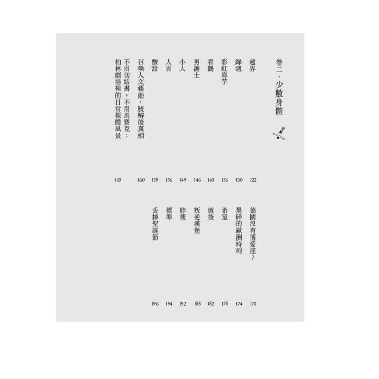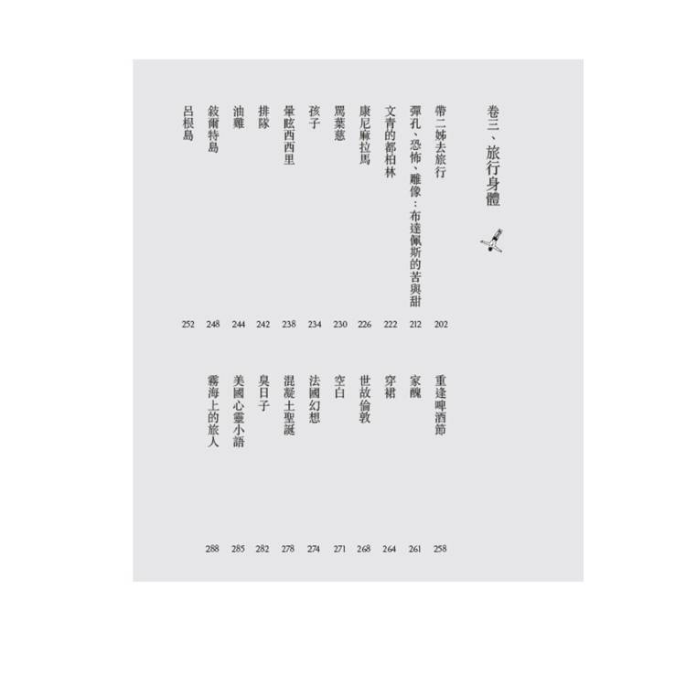 ★ 抓取個人異地生活經驗,寫旅行途中的身體變異,寫身體與他者文化的短暫交會。
