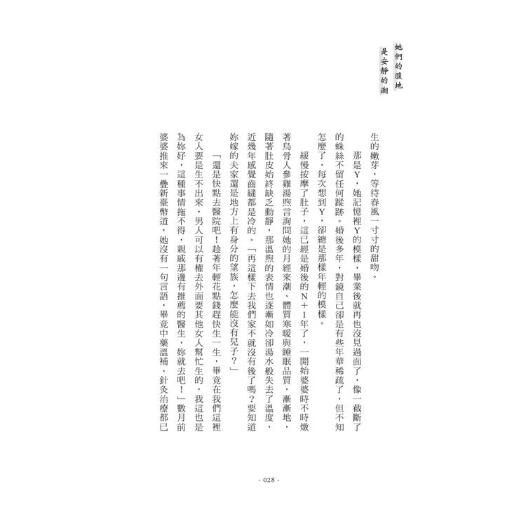 這是一本關於女性身體的低鳴之書,七個故事輕聲訴說女人的傷與再生,七種在潮汐間漂流的命運:從不孕到產後、母職到更年,由被凝視的軀殼到尋回自我的靈魂。她們在血與愛的邊界間試探,在花開與凋謝之間學會堅韌地活著。