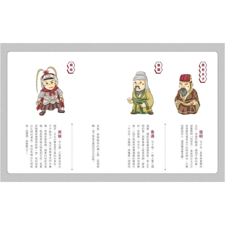 這一套兒童版【奇想三國】,其實也同樣面對如何重新塑造處理三國英雄人物的難題。如果延續小說《三國演義》的文獻紀錄來寫諸葛亮與劉備的英勇事蹟,當然是順水推舟、事半功倍。因為小說《三國演義》本來就是以「擁蜀抑曹」為立場的敘述角度;諸葛亮的神機妙算與劉備的仁義兼備只要順著小說原來的旋律加以改寫,就足以令人悠然神往。但是若要用同一筆調描寫孫權就扞格不合了,因為《三國演義》雖然表面是寫三國逐鼎之爭,骨子裡小說家的敘述角度卻巧妙的落在蜀魏爭霸的動線上,而孫吳其實一直是被邊緣化與丑角化。試看其赤壁英雄周公瑾,始終被寫成一個心胸狹窄,不識大體的輕佻之士;而魯肅也只是一位唯唯諾諾的甘草人物。但歷史上的孫權連曹操都不禁讚歎:「生兒當如孫仲謀」,而魯肅對天下大勢的精準分析,比諸葛亮的「隆中對」更要早了七年。他的身材魁武雄壯,也絕不是平劇上略顯駝背、不堪負重的造型。所以本系列寫到孫權的時候,就不得不跳過小說《三國演義》。因為《三國演義》的孫權在周瑜的慫恿下,居然天真的想用自己的妹妹當釣餌,去誘騙劉備過江招親,結果落了個「賠了夫人又折兵」的笑柄。別忘了歷史上的孫權深黯天下大勢之所趨,知道唯有把荊州借給劉備,讓劉備替孫吳去阻擋北方的曹操,才是對東吳最有利的規劃。這一些都是要由《三國志》及裴松之引據的相關史料來加以重新推測組合。