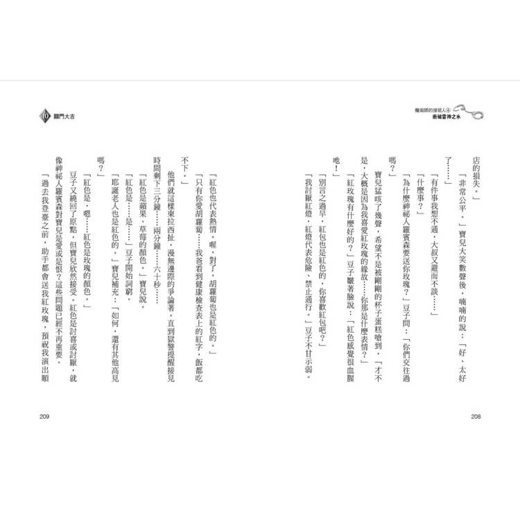 當然,這兩冊小說的核心,並非僅是兩位魔術師的技巧較量,而是對「競爭倫理」和「自我救贖」的深刻探討。瓜爾佳代表著新一代的明星魔術師,他聰明、迷人,追求個人榮耀;而寶兒的參戰,卻是為了終結魯鬼斧遺留下來的犧牲循環。當他們面對鬼門關的最終挑戰時,所有人都意識到這關卡毫無生路,豆子卻悟出魯鬼斧真正的設計理念:「魔術師無法獨自面對鬼門關,必須通力合作。」這使得所有人放下恩怨,緊密合作才存活下來。
