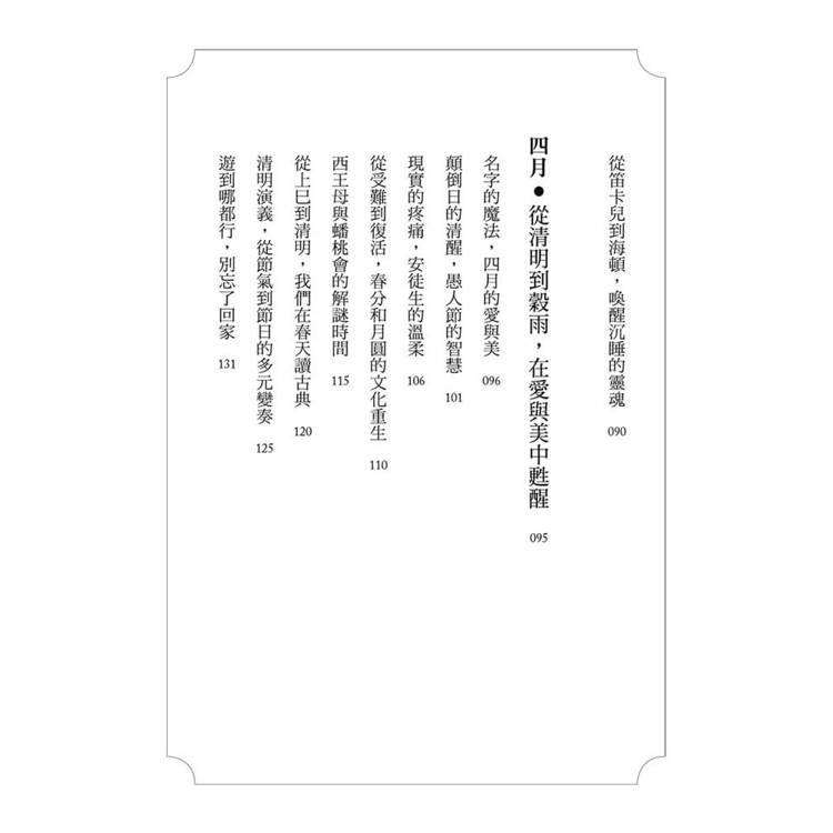 首次翻閱就領受到一種自在,講的是典故,卻不必有正襟危坐的肅然。既是為季候溯源的知識庫,也是千古風流人物的絢麗索引;考據文字,令人忘其艱澀;王母與宙斯並論,不見任何唐突;民俗與花卉盡收眼底,眾神逐愛,有如凡胎;時而任意穿梭古今,宛如天馬行空,偏是亂中有序,盡在作者的思考結構中;光陰為宇宙立座標,攤開那三維空間,今昔前後只是相對,悠然神往之際,不自覺的與萬事萬物齊一,驀然回首,你我與天地同在。
