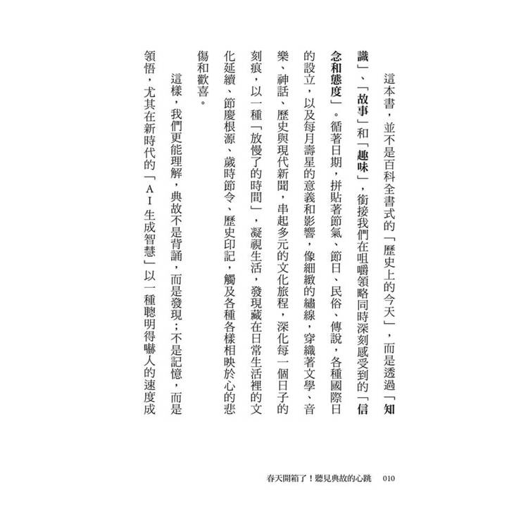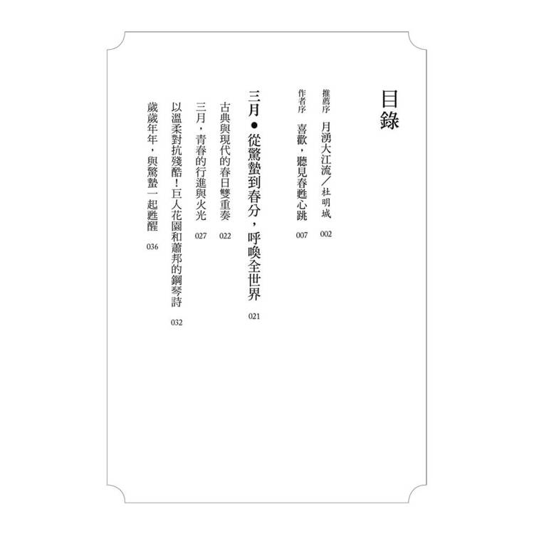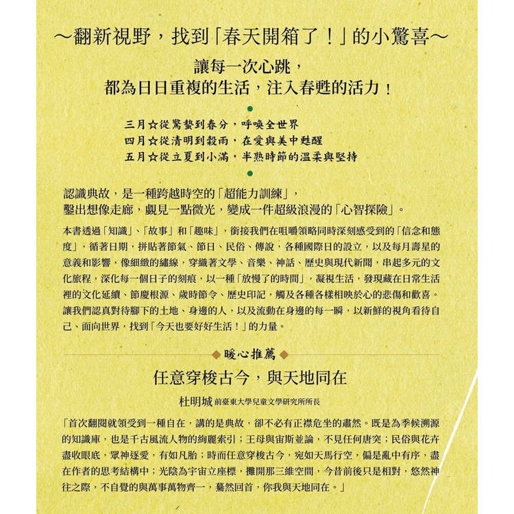 《春天開箱了!聽見典故的心跳》是《四季有典微光》四部曲的春甦樂章,四時循環興替,無始無終,是以儘管依月日排序,何妨「揀日不如撞日」,翻到哪讀到哪。