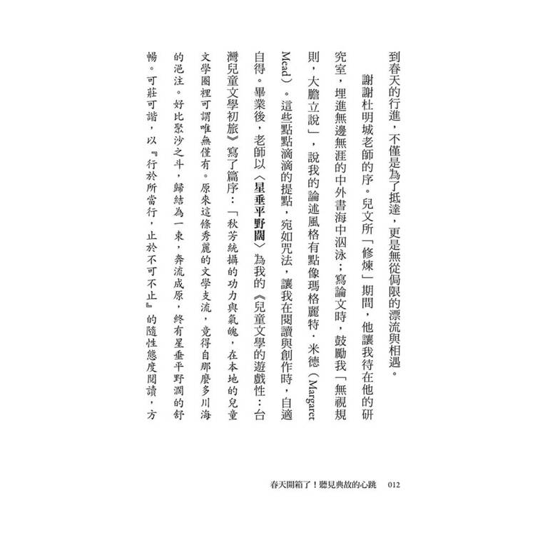 謝謝杜明城老師的序。兒文所「修煉」期間,他讓我待在他的研究室,埋進無邊無涯的中外書海中泅泳;寫論文時,鼓勵我「無視規則,大膽立說」,說我的論述風格有點像瑪格麗特.米德(Margaret Mead)。這些點點滴滴的提點,宛如咒法,讓我在閱讀與創作時,自適自得。畢業後,老師以〈星垂平野闊〉為我的《兒童文學的遊戲性: 台灣兒童文學初旅》寫了篇序:「秋芳統攝的功力與氣魄,在本地的兒童文學圈裡可謂唯無僅有。原來這條秀麗的文學支流,竟得自那麼多川海的浥注。好比聚沙之斗,歸結為一束,奔流成原,終有星垂平野濶的舒暢。可莊可諧,以『行於所當行,止於不可不止』的隨性態度閱讀,方能盡其佳妙。」