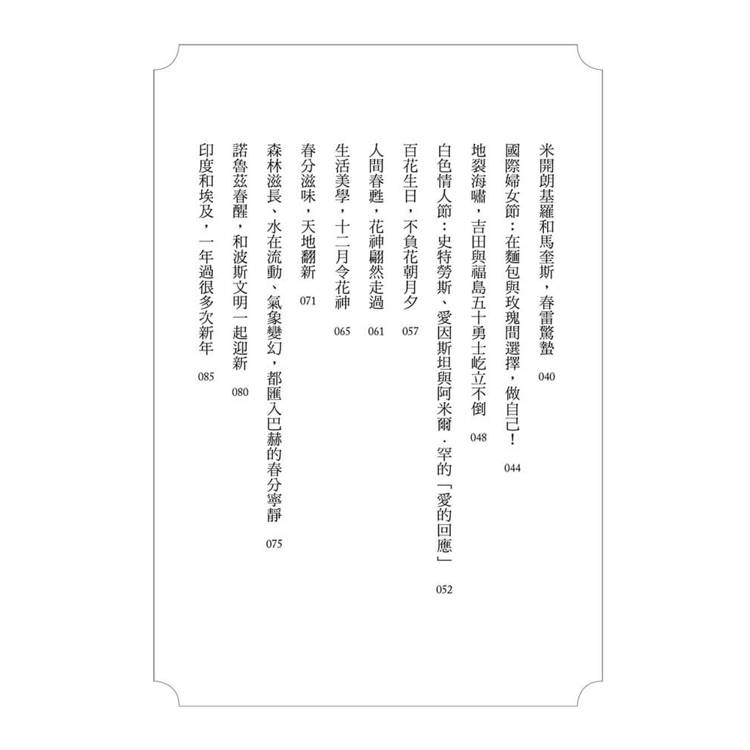 這本書,最令人折服處在於取材之廣。先是以字源揭開序幕,另以神話當註解;中外曆法的對照,吹散了文化認知的迷障;節慶、時令與植物、花卉、飲食相應合,宗教盛會與佳節紀事,處處蘊含民俗學的根柢。文學的風采,不掩科學的火花,藝術家的彩繪和音樂家的絕響在大千世界中聲色交會。名流的傳記以史書為憑,佐以軼聞、筆記;自然的災難、政治的喧囂、文化的浮沉、社會的動盪,不以春天而消停,卻也常在春季解厄;從驚蟄到春分,從清明到穀雨,再從立夏到小滿,宛如冥后波瑟芬妮 (Persephone) 出了地府,萬物復甦。