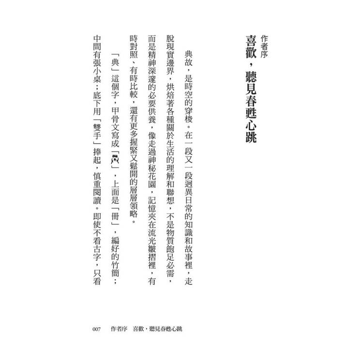 「典」這個字,甲骨文寫成「 」,上面是「冊」,編好的竹簡;中間有張小桌;底下用「雙手」捧起,慎重閱讀。即使不看古字,只看現代字形,也像極了擺在桌上的一整排書,因為喜歡,常常翻閱,所以需要串繩保固,成為讓人尊重的「倖存於時間篩汰的紀錄」。「故」這個字,由「古」和「攴」共同組成,「古」包含十個「口」,象徵各種版本的不同傳說,由這張嘴流浪到那張嘴,形成各種差異和變形,真相就在這些輾轉口傳的過程中消失了;「攴」則是拿著小武器輕輕敲打,努力在消失的過去中,找回一點點真相。認識典故,就變成一種跨越時空的「超能力訓練」,鑿出想像走廊,覷見一點微光,一路尋找著各種時間、土地、生命脈動的不同撞擊,在不斷重複的每一天創造出深邃的轉折,變成一件超級浪漫的「心智探險」。