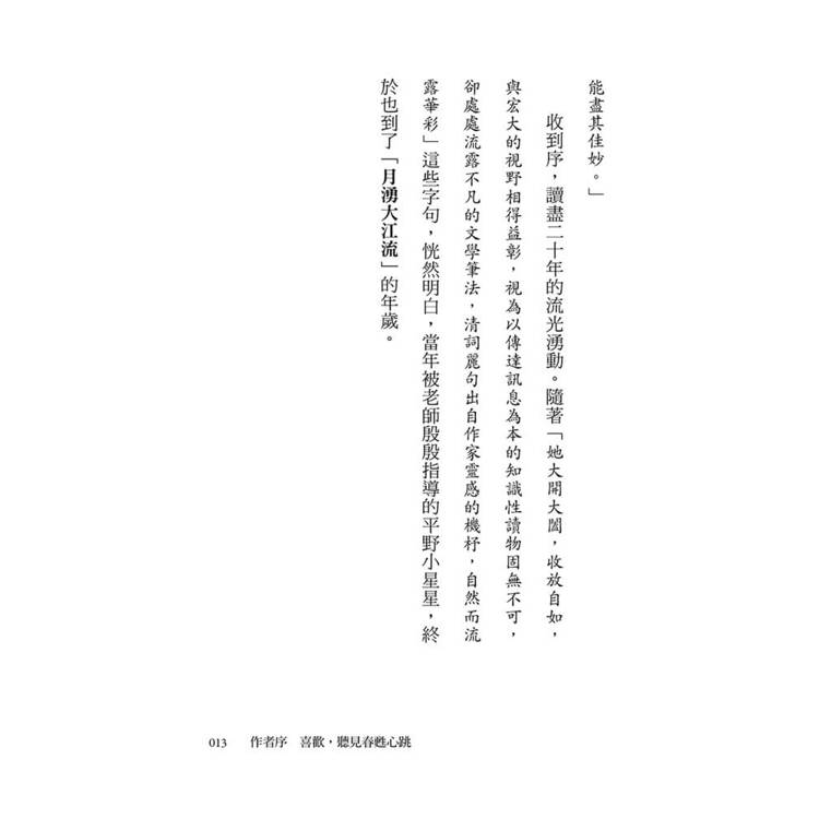 收到序,讀盡二十年的流光湧動。隨著「她大開大闔,收放自如,與宏大的視野相得益彰,視為以傳達訊息為本的知識性讀物固無不可,卻處處流露不凡的文學筆法,清詞麗句出自作家靈感的機杼,自然而流露華彩」這些字句,恍然明白,當年被老師殷殷指導的平野小星星,終於也到了「月湧大江流」的年歲。