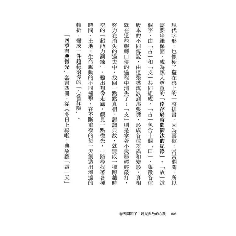 「四季有典微光」套書四冊,從《冬日上線啦!典故讓「這一天」不一樣》出發,努力為生活添加光焰,在封凍艱難的日子裡看見希望;隨著曆法演變,感受全世界從古到今的文化風俗,在新、舊兩個年間,孕養著無限可能;而後在《春天開箱了!聽見典故的心跳》,曆法變革幻變成花季興衰,從東、西方神話的啟示,象喻人事變化中的悲歡與堅持,凸顯出春天的多重意象,在理性、感性與知性間,尋找生活的秩序與詩意。接著,我們又將在《夏日限定喔!典故漫遊放輕鬆》,遍歷夏日豔盛;最後在《秋天別急啊!典故下載中》,檢視秋熟的凋零和蘊藏,從中領略生命的循環與人生的意義。