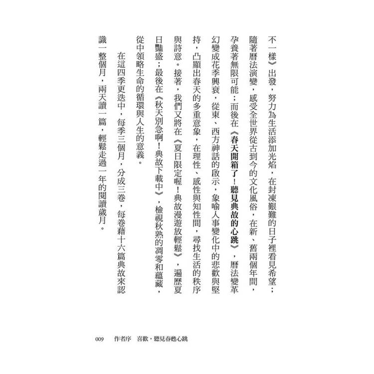 在這四季更迭中,每季三個月,分成三卷,每卷藉十六篇典故來認識一整個月,兩天讀一篇,輕鬆走過一年的閱讀歲月。