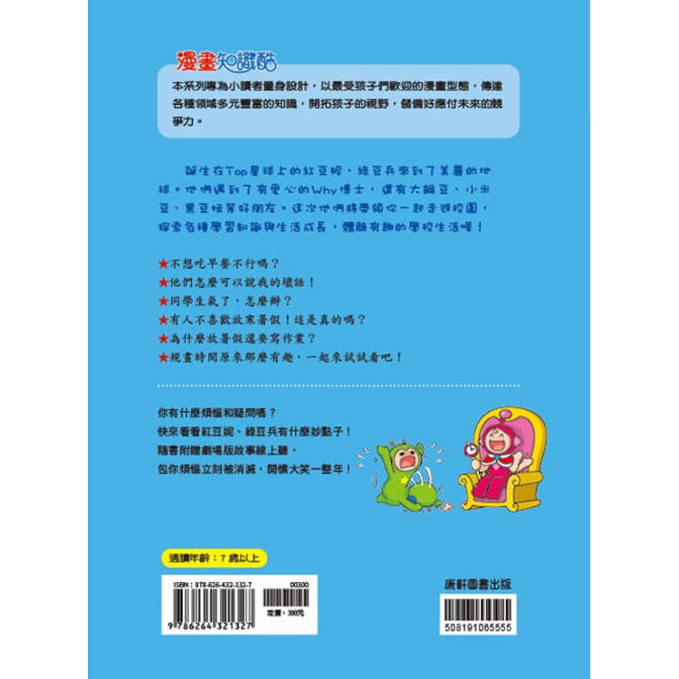 誕生在Top星球上的紅豆妮、綠豆兵來到了美麗的地球。他們遇到了有愛心的Why博士,還交到了大鋼豆、小米豆、黑豆妞等好朋友。這次他們將帶領你一起走進校園,探索各種學習知識與生活成長,體驗有趣的學校生活喔!