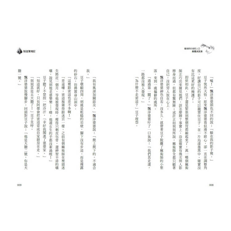 「差遠嘍,密道複雜得跟迷宮一樣。之前有個麻術師在裡頭迷失將近一個月,等他被發現時,瘦得只剩皮包骨,還神智不清的嚷嚷,說見到他老婆樂樂——嗐,他連女生的手都沒牽過哩!」