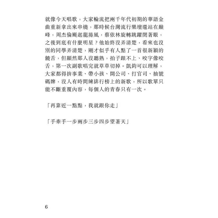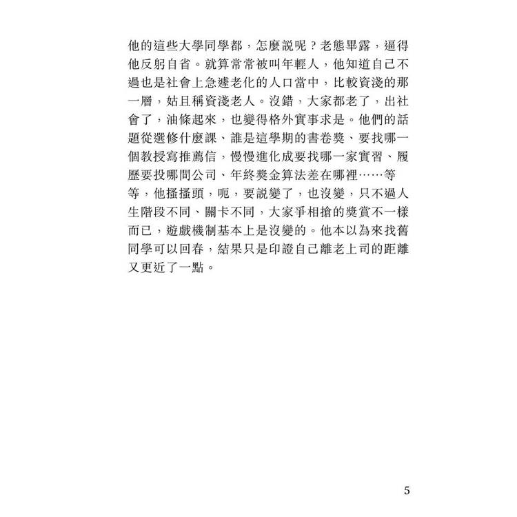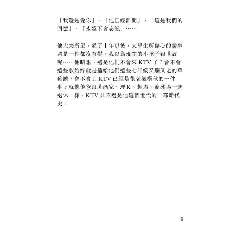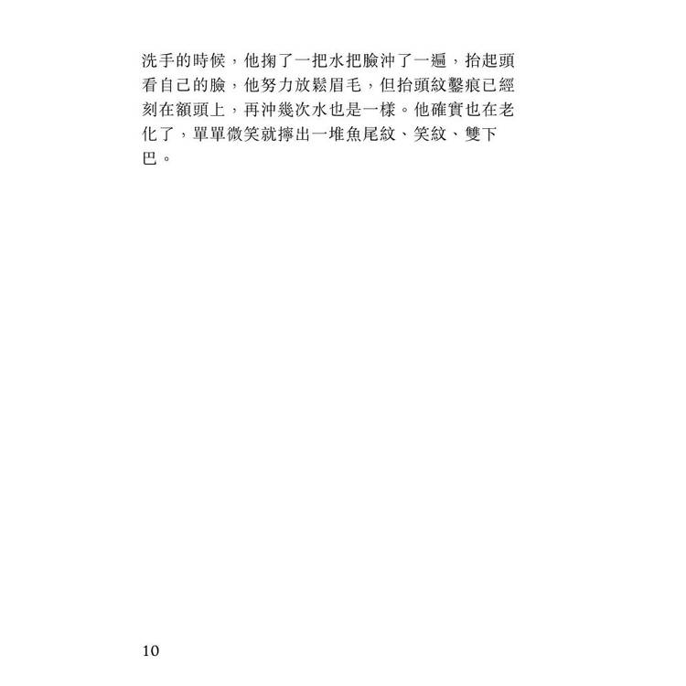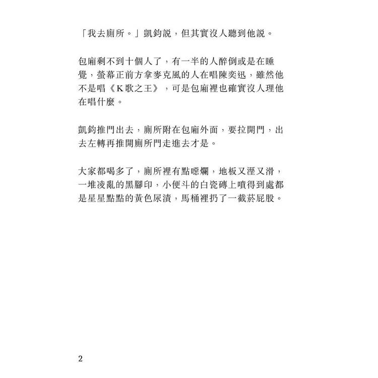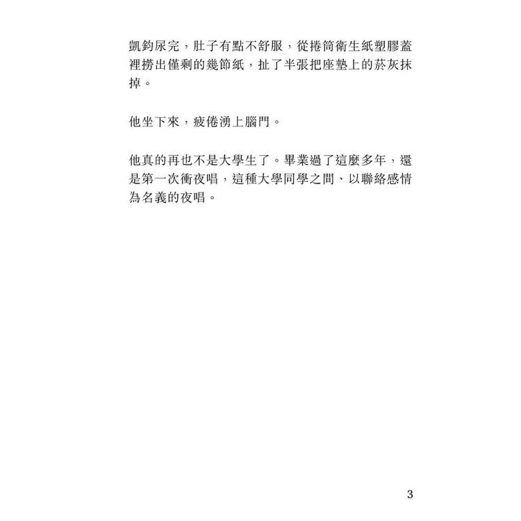 他們這群同學裡面,女生老得尤其快,當然也有可能是他天性看女生多過看男生一點,所以才觀察出來。比方劉依倫吧,以前是學校有名的美女,算是非正式的系花,現在妝比以前濃了五倍以上,眼睫毛應該是黏的或種的、植的,尺寸大得相當不自然,在 KTV 包廂裡還算剛好,還有一點遲暮的漂亮,但剛剛晚餐的時候有點見光死,他可以很清楚地看到睫毛膏卡在她的眼窩裡。最令他吃驚的倒是系花的態度,以前她很高冷,要等男生做球來了才會聊天,如今卻非常健談。凱鈞剛到餐廳,她就一屁股坐到他旁邊噓寒問暖,害他差點自戀地以為系花怎麼突然開天眼了。直到飯局後段他才看出來,系花對所有人展示一視同仁的親暱,她的聊天技巧好到各人的交往狀態、年收入、玩哪幾檔股票通通無所遁形。聽說這女人現在在某家珠寶外商當行銷總監,不可大意、不可大意。