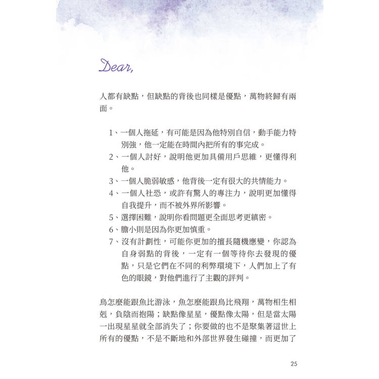 鳥怎麼能跟魚比游泳,魚怎麼能跟鳥比飛翔,萬物相生相剋,負陰而抱陽;缺點像星星,優點像太陽,但是當太陽一出現星星就全部消失了;你要做的也不是聚集著這世上所有的優點,不是不斷地和外部世界發生碰撞,而更加了解你自己。