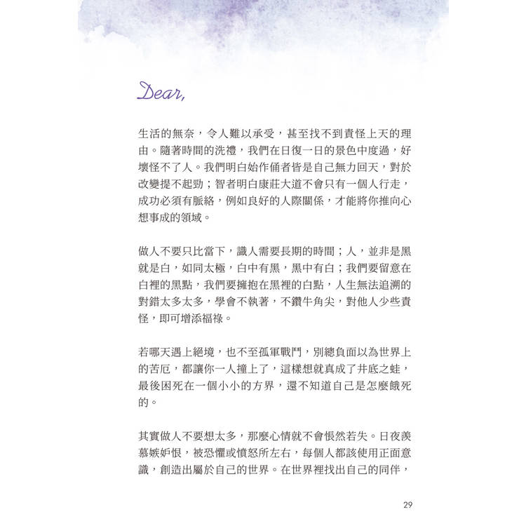 若哪天遇上絕境,也不至孤軍戰鬥,別總負面以為世界上的苦厄,都讓你一人撞上了,這樣想就真成了井底之蛙,最後困死在一個小小的方界,還不知道自己是怎麼餓死的。