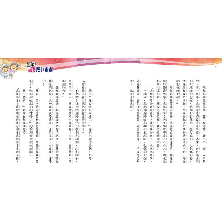 看著孩子一張張純真無邪的臉蛋,總覺得他們十分無辜,忍不住想特別提醒父母:孩子是最珍貴的資產,在不得不產生家庭結構變動的時期,別忘了格外注意他們的感受,給予他們更完整的關愛和照顧,才不會讓他們受傷,受委屈。