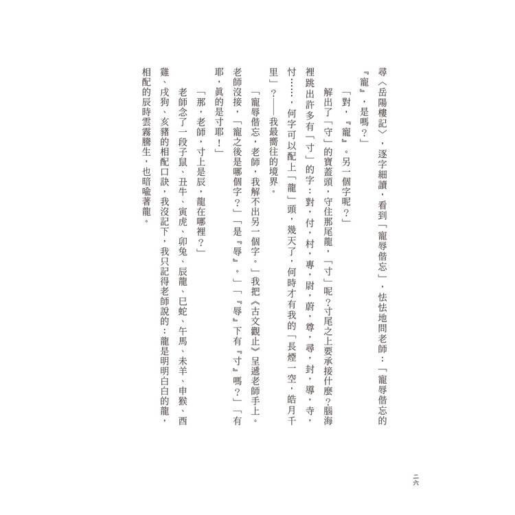 《淮南子.本經訓》載:「昔者倉頡作書而天雨粟,鬼夜哭。」唐代張彥遠解釋云:「造化不能藏其密,故天雨粟;靈怪不能遁其形,故鬼夜哭。」很顯然,人們很早就認識到,世界無盡的秘密是藏在語言文字中的。或者說,正是語言文字,使「造化不能藏其密」,讓「靈怪不能遁其形」。走向世界,首先是走向語言文字,因為語言文字是通向世界的橋樑。就人的生命而言,世界的拓展,在很大程度上是隨著語言文字的不斷延伸而展開的。文學是對世界的一種連接,而這種連接本質上也是通過語言文字達成的。在〈龍,詩一樣虛實穿梭〉中,蕭蕭說,喜歡文學,一開始他就迷上文學最小的單位:一個個獨立的方塊字,魔力無限。字形拆拆合合,有著後來陪孩子玩樂高的趣味;字音可以試著觸碰這個字還是另一個,通假的可能;字義開放歧出,隨心意紛飛,忽而升天忽而入地,樂趣無窮。後來為了考研究所,傾全力鑽研文字學,岔出去探索文字與命理的關係。漢語言文字以六書作為組合表義方式,包括文字字形和字義之間的關係,文字的意義之間的關係。蕭蕭認為,「中國文字的形成,往往可以看出一種文化成長的初衷、動機,甚至於研發的過程。」「可見深入認識一個『字』的原始面貌是認識事物最基本的功夫。」(〈古琴二字的六書馳想〉)而且,文字與生命緊相呼吸。讀蕭蕭的作品,我們能深深體察到,能感悟到世界萬事萬物之間的秘密有許多是藏在文字之間的,人類精神世界與語言文字之間是互動互構的。