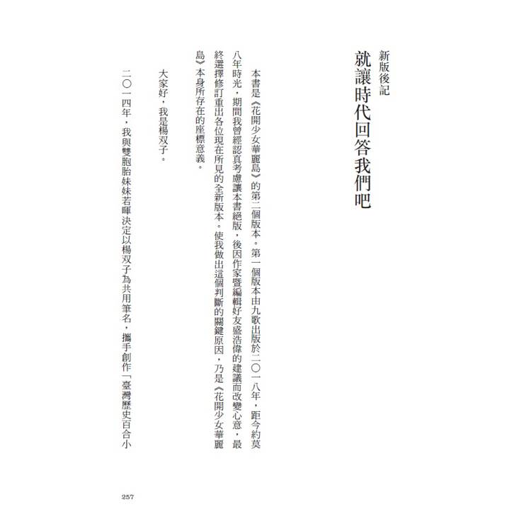 本書是《花開少女華麗島》的第二個版本。第一個版本由九歌出版於二〇一八年,距今約莫八年時光,期間我曾經認真考慮讓本書絕版,後因作家暨編輯好友盛浩偉的建議而改變心意,最終選擇修訂重出各位現在所見的全新版本。使我做出這個判斷的關鍵原因,乃是《花開少女華麗島》本身所存在的座標意義。