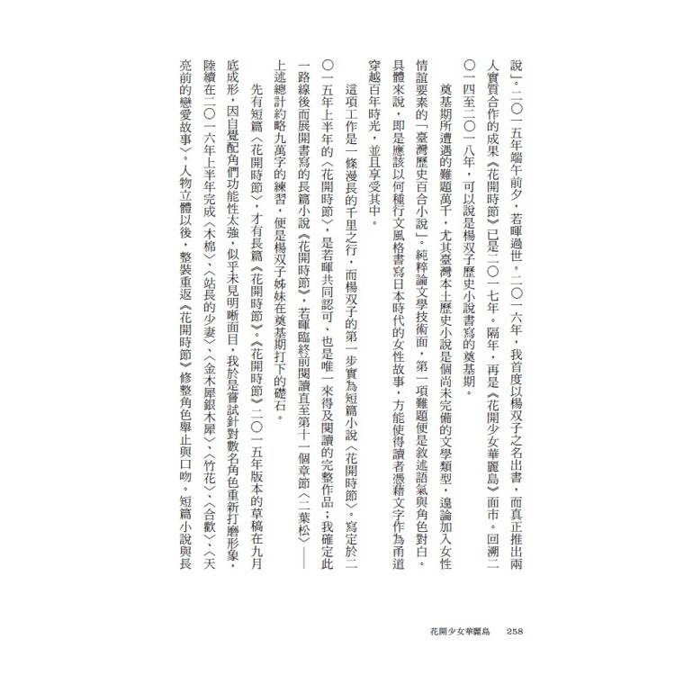 這項工作是一條漫長的千里之行,而楊双子的第一步實為短篇小說〈花開時節〉。寫定於二〇一五年上半年的〈花開時節〉,是若暉共同認可、也是唯一來得及閱讀的完整作品;我確定此一路線後而展開書寫的長篇小說《花開時節》,若暉臨終前閱讀直至第十一個章節〈二葉松〉——上述總計約略九萬字的練習,便是楊双子姊妹在奠基期打下的礎石。
