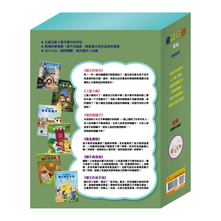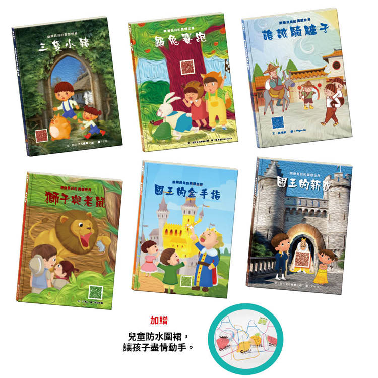 童話幻想 套組(國王的新衣∕三隻小豬∕誰該騎驢子∕龜兔賽跑∕獅子與老鼠∕國王的金手指)贈 兒童防水圍裙