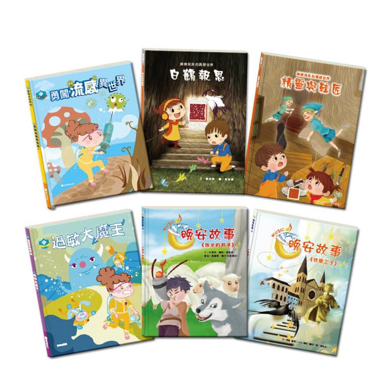 故事大合集 套組(【衛教小尖兵:勇闖流感異世界+過敏大魔王】+【樂樂貝貝的異想世界:白鶴報恩+精靈與鞋匠】+【晚安故事:放羊的孩子+快樂王子】),贈防護面罩