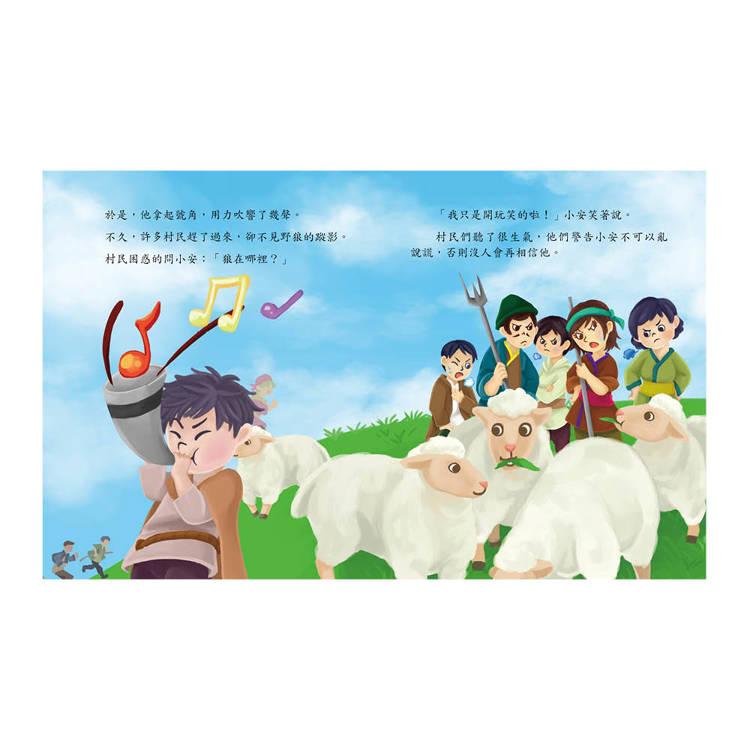 看著一群大人傻傻的跑來跑去,小安覺得好有趣喔!三番兩次被小安欺騙的村民漸漸的不再相信他了。結果,附近好像出現了奇怪的動物……;天啊!難道真的是狼來了!……