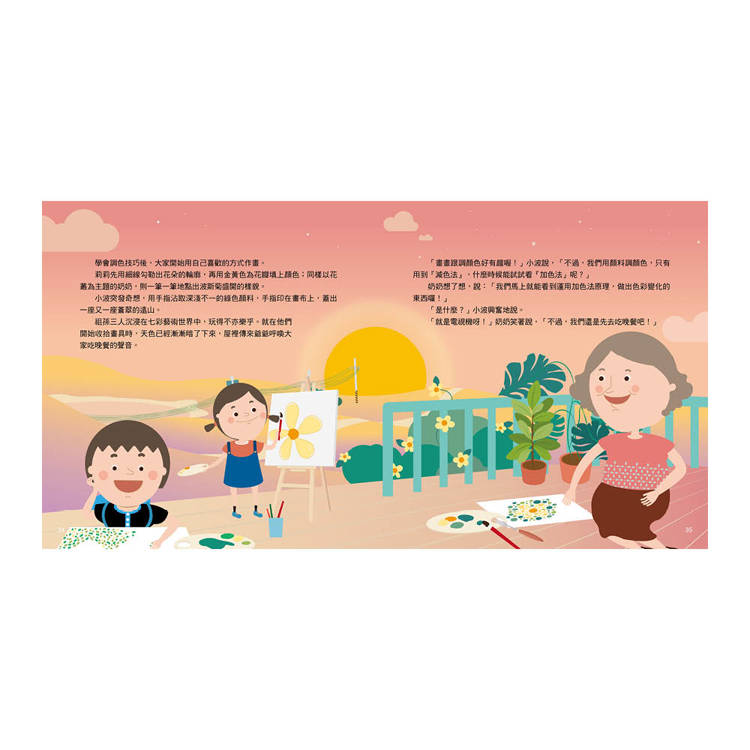 小波一家趁著假日回鄉下探望爺爺、奶奶,計畫好的踏青之旅卻被一場雨打亂了!幸好很快就雨過天晴,他們和爺爺悠閒散步,陪奶奶愜意寫生;清澈的藍天和美麗的彩虹,以及千變萬化的繪畫顏料,都讓他們倍感好奇:顏色是怎麼產生的?快加入小波和莉莉的色彩探索之旅!