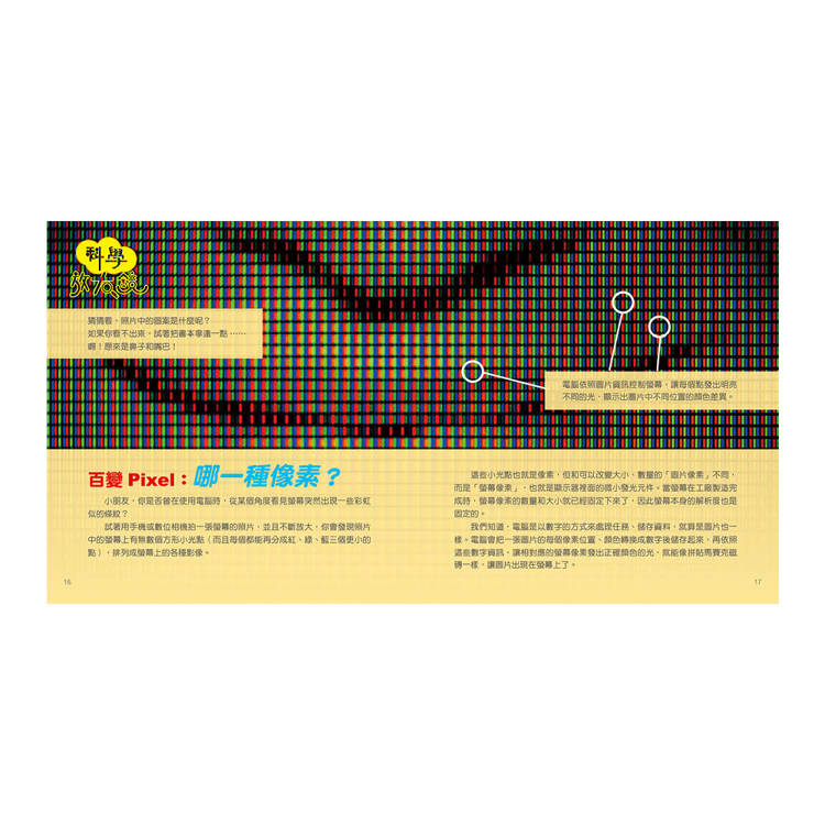 小波和莉莉迫不及待地跟著爺爺去看展覽,一幅幅神秘風格的畫作,引發大家的好奇心... 知識淵博的亞特登場了!這些滿是小格子的「像素畫」有什麼特別之處?蘊含什麼知識學問?讓我們翻開書本,一起進行像素挑戰,動手編程,感受光彩的奧妙吧!