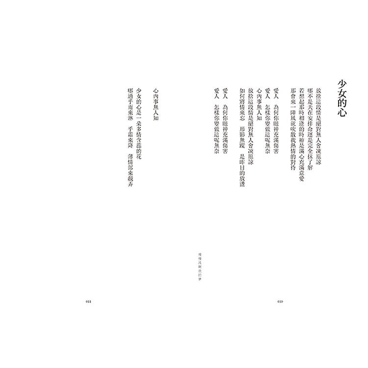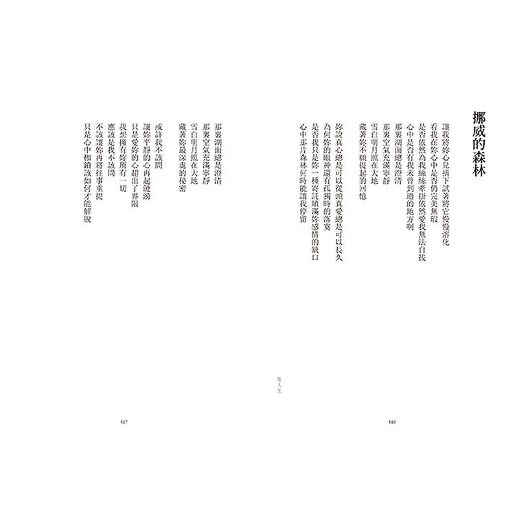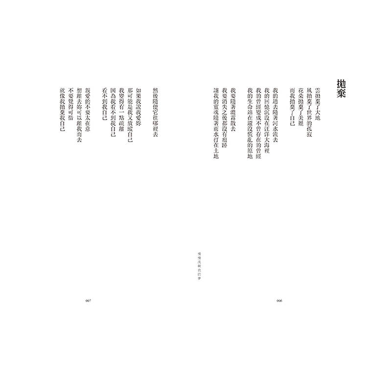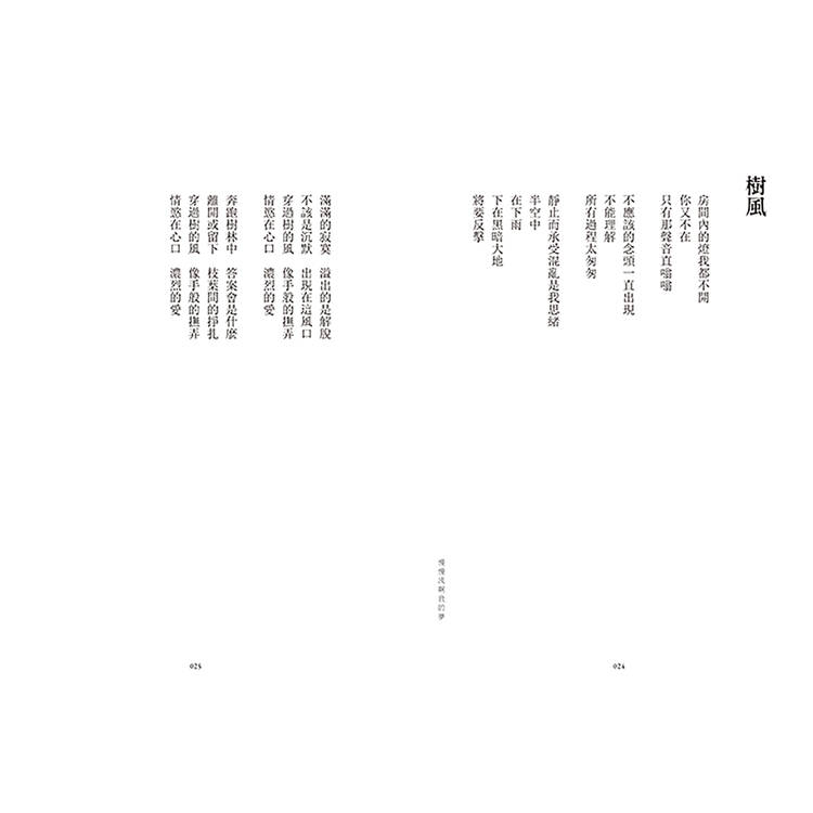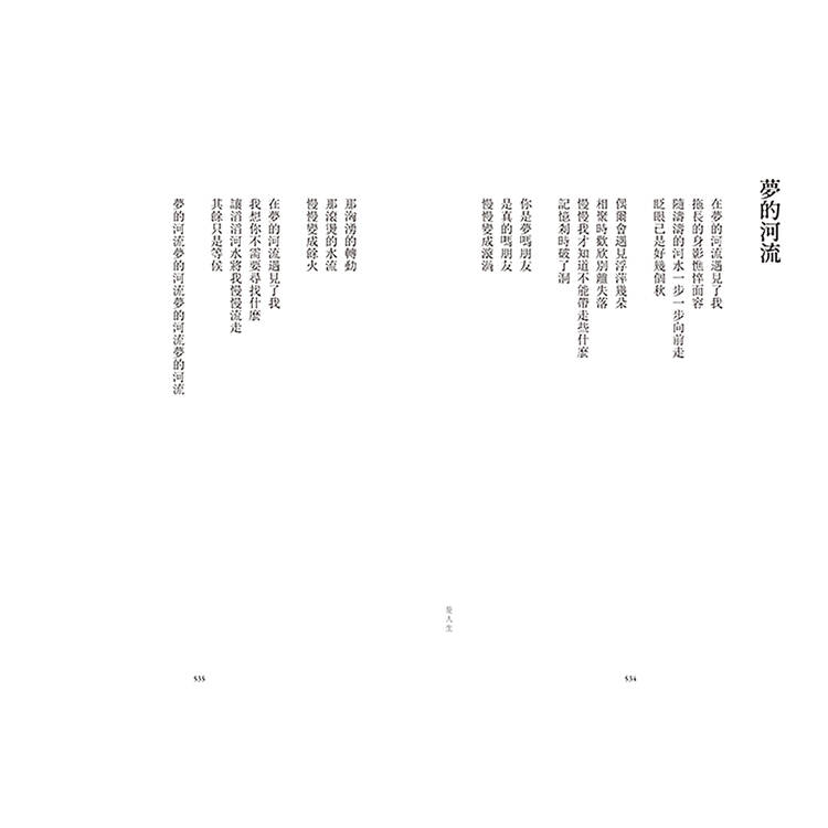 「飛翔時傷悲是一種奢侈的行為/我怎麼突然有一種莫名的喜悅當我穿梭在黑暗裡面」,伍佰的詩中盡是衝突的自由,是一名離家北上的音樂詩人對昨日與明日的反覆質問,他的文字擁有絕對的旋律,字句能隨時出入,一首詩創造了多種歧義的靈魂。聽伍佰的音樂理所當然,我們心中各有夢幻歌單,然而,一旦視角全面由「文」與「字」切入,得以發現他書寫的是:溝通彼此的介質。舞台上他將自身狂狠地拋往聽者,詩集裡的他則緩緩傾訴,是一名寧可背對讀者而讓出解釋權的詩人。詩也是活的,放心閱讀、理解吧──他將成為每個人的身影。從〈少女的心〉到〈樹風〉的愛戀離捨、從〈斷腸詩〉到〈深秋的祝福〉的死生意象……伍佰另闢蹊徑,編整篇目,尋獲新的觀看角度,種種懸念又生葉發枝,令水倒流。他的語言亦即透明的容器,放置眾多意識,卻顯得收斂而節制。當初以創作對抗人生的青年,如今仍在,我們也依舊浸潤在「穿越時空之中漫天繁星晶瑩的眼淚」裡,年歲變了,時間移動不止,伍佰持續在刺探生命的可能性,而那將成為暗示,紛紛落在我們肩上,一起慢慢地流。