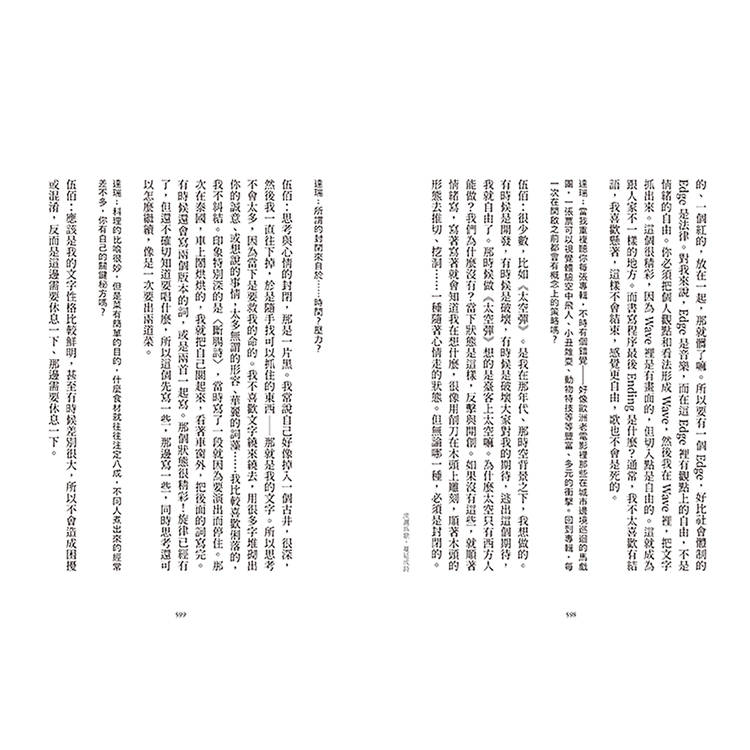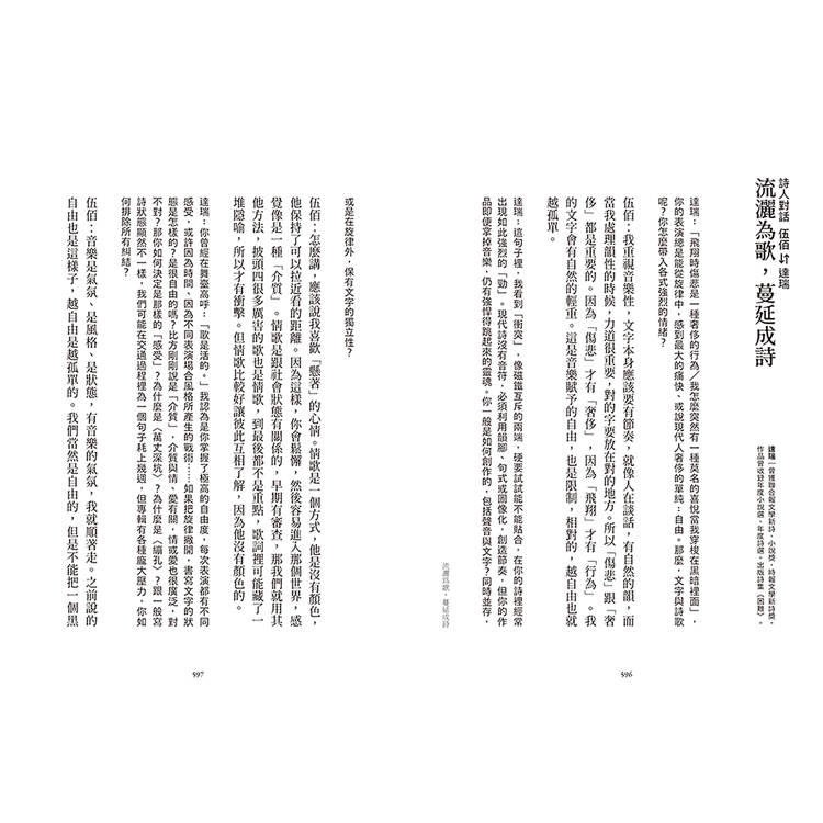 ★ 收錄詩人對談,伍佰檢視詩文之於自我的多角度意義,從創作狀態切入,書寫狀態的現場重建、意象安置的再詮釋,探索詩句裡的自由與情緒是從何而來?將往何去?一次理解伍佰創作的奧義。