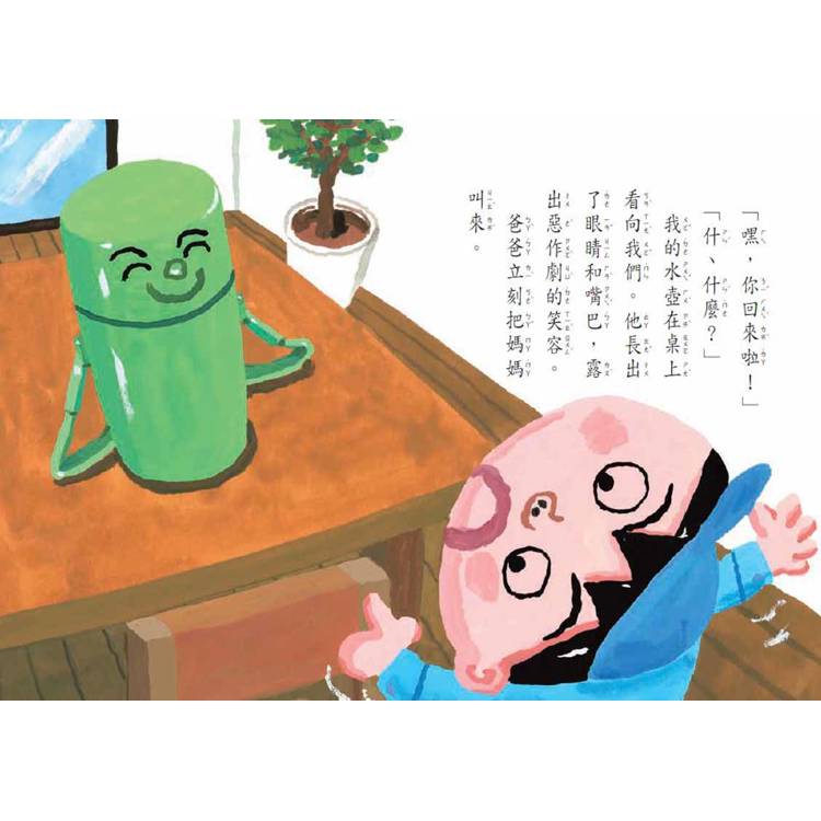 這時,健一的水壺突然長出了眼、鼻、口,對健一一家人發出了抗議:「居然把我丟在家裡,不帶我去露營,太過分了吧。」邊說邊搖晃著身體,發出咖拉咖拉的聲音……