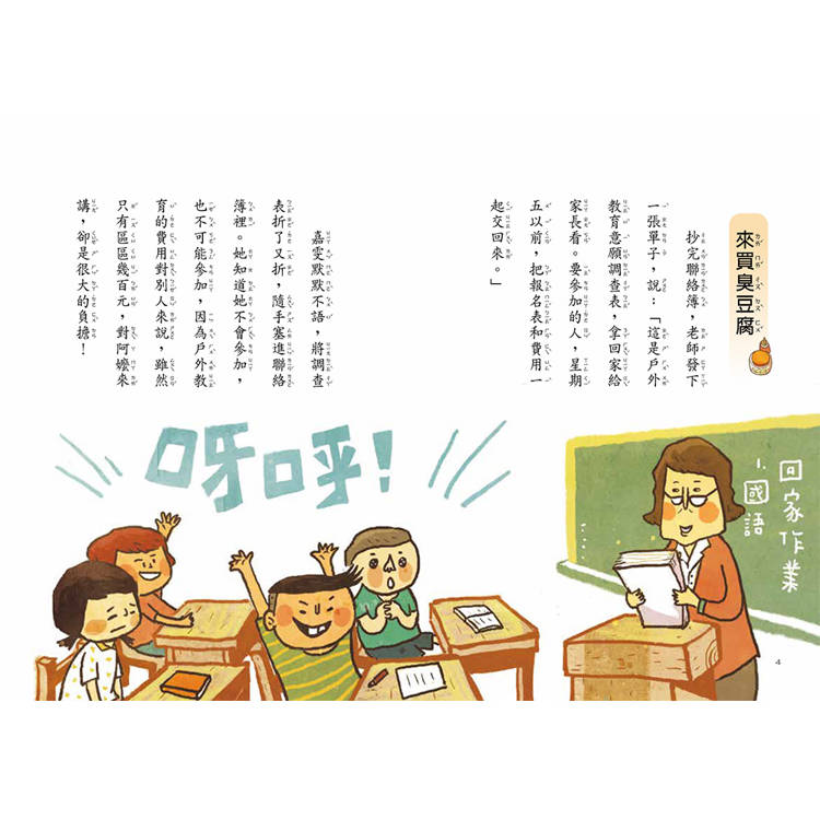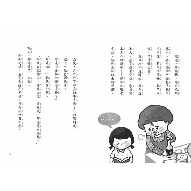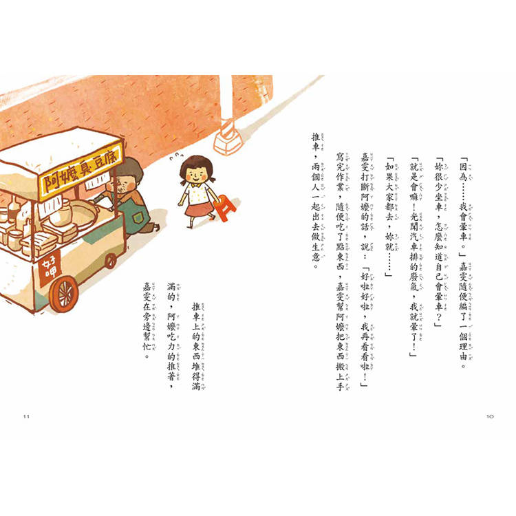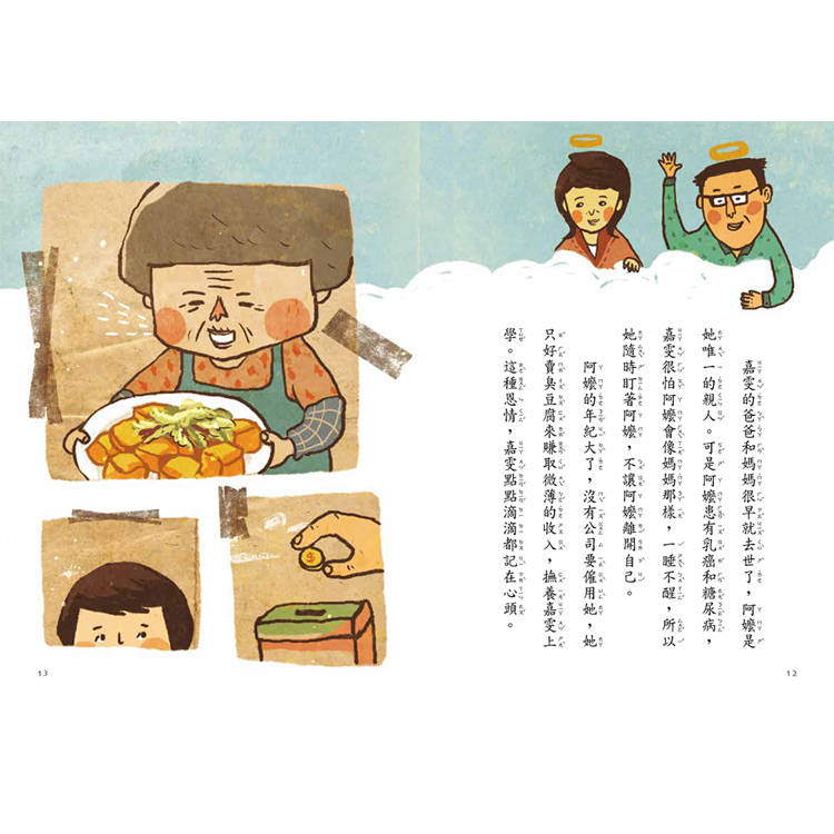 嘉雯的爸爸和媽媽很早就去世了,阿嬤是她唯一的親人。每天放學,她都和阿嬤推著車子在路邊賣臭豆腐,賺取微薄的收入,日子過得很辛苦。一天,一輛黑色轎車在攤子前停下來,一位西裝筆挺的男士下了車。他看看阿嬤,又看看嘉雯,點了一份臭豆腐。吃完之後,男士付了錢,驅車疾駛而去,卻在桌上留下一個厚厚的紙袋,紙袋裡裝著一疊藍得耀眼的千元大鈔。嘉雯會收下這筆錢嗎?她會怎麼做呢?看嘉雯的故事,學習她的獨立、勇敢和堅持;也學習她孝順的心。